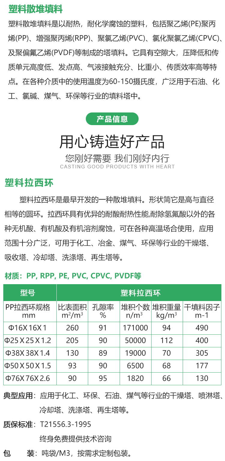 塑料散堆填料:塑料散堆填料是以耐热,耐化学腐蚀的塑料,包括聚乙烯(PE)、聚丙烯(PP)、增强聚丙烯(RPP)、聚氯乙烯(PVC)、氯化聚氯乙烯(CPVC)、及聚偏氟乙烯(PVDF)等制作的塔填料。