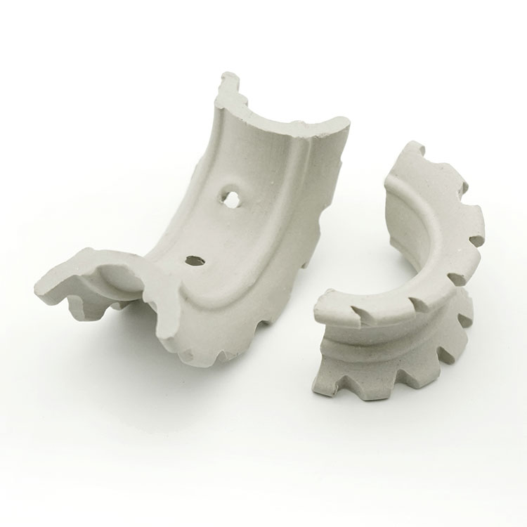 陶瓷异鞍环填料是在矩鞍环填料的基础上加以改进的新型填料,将矩鞍环填料的平滑弧形侧面改为锯齿形或纹纹凸起的侧面。这样在填料床层内,增加了填料间接触的空隙。