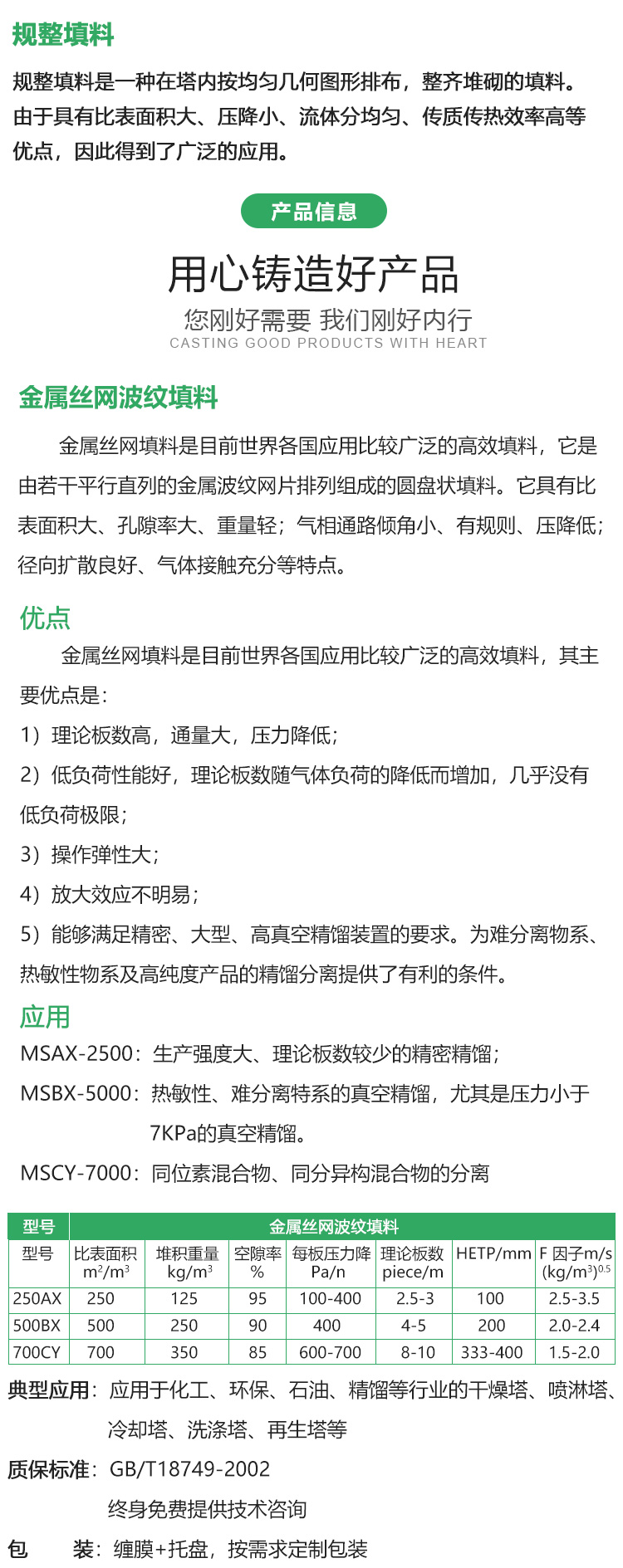 金属丝网填料是目前世界各国应用比较广泛的高效填料,它是由若干平行直列的金属波纹网片排列组成的圆盘状填料。它具有比表面积大、孔隙率大、重量轻;气相通路倾角小、有规则、压降低;径向扩散良好、气体接触充分等特点。操作弹性大,能够满足精密、大型、高真空精馏装置的要求。为难分离物系、热敏性物系及高纯度产品的精馏分离提供了有利的条件。