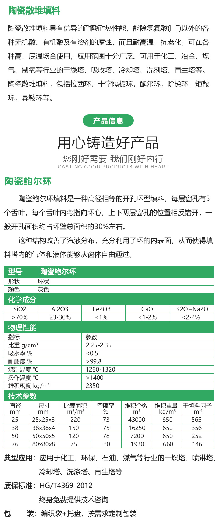 陶瓷鲍尔环填料是一钟高径相等的开孔环形填料,每层窗孔有5个舌叶,尺寸有25mm、38mm 、50mm、76mm等,主要用在喷淋塔,洗涤塔、干燥塔等环保设备里面,最佳伴侣,由于比表面积大,