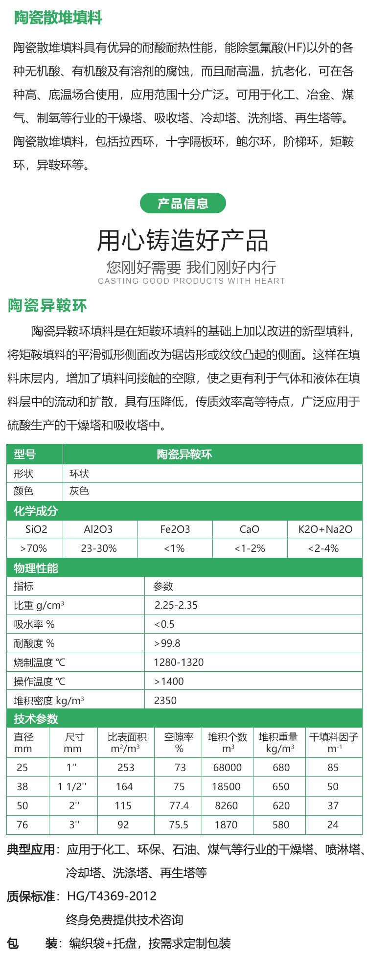 陶瓷异鞍环填料是在矩鞍环填料的基础上加以改进的新型填料,将矩鞍环填料的平滑弧形侧面改为锯齿形或纹纹凸起的侧面。这样在填料床层内,增加了填料间接触的空隙。